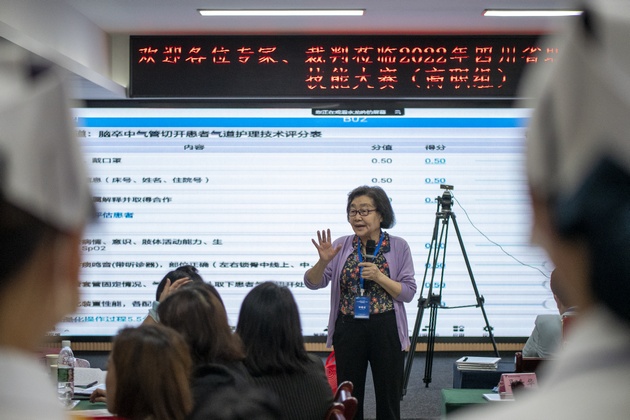 据悉本次大赛的裁判由来自行业和职业院校的27 位知名专家组成,裁判们敬业高效、公正执裁、精益求精,确保了本次大赛的圆满成功。在大赛闭幕总结会上,四川省人民医院外科科护士长、主任护师马青华和四川省肿瘤医院重症监护室总护士长、主任护师向明芳分别就第一、二赛道赛项做了精彩点评,她们强调对于病人,要做到“始于其乎,终于其乎”,在肯定参赛选手突出表现的同时,也详细指出了存在的不足与缺点并提出了具体建议。南丁格尔奖获得者、大赛仲裁组组长、四川大学华西医院医院管理研究所成翼娟则对大赛作了全面系统的点评。她高度评价了太阳成集团tyc122cc作为承办单位在准备设施上的实力以及对本次大赛的精心筹备和安排,并提出了宝贵的指导建议。她指出,高职护理专业人才培养要与新时代职业教育发展深度融合,注重对员工评判性思维、心理素质、职业安全防护等能力的培养,以赛促教、以赛促学、以赛促改,培养更多优秀的高素质护理技术技能人才。