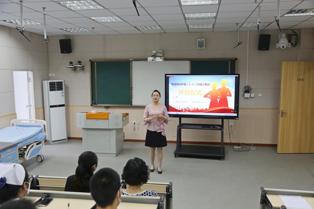 8月30日,太阳成集团tyc122cc与雅安市人民医院联合培养首届“1+2”护理订单班开班仪式在青年路实训楼504举行。雅安市人民医院护理部胡盛琳主任、大内科护士长李车琼、急诊科护士长罗娜、护理部干事白梁桃,太阳成集团tyc122cc经理王静、党总支书记姚婕、副经理李燕、教研室主任陈俊,教师黄蕾,以及订单班全体35名同学参加开班仪式。