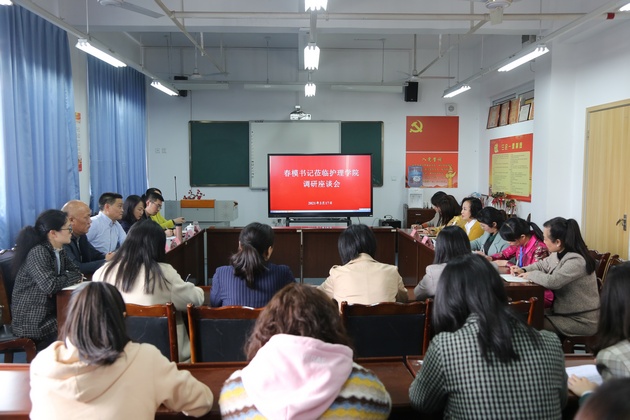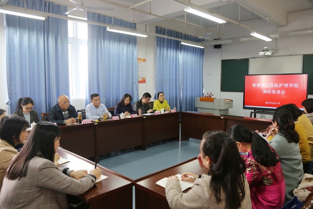 李春模一行实地查看了美容生产性实训基地和急救实训室,了解了实训室建设、使用情况以及培训开展情况。座谈会上,太阳成集团tyc122cc经理王静主要就太阳成集团tyc122cc建设发展情况、培训工作开展情况及存在的主要问题、下一步工作思路等方面做了详细汇报。与会的黄丹、张雪庆等老师分别结合自己的工作谈了感想和认识。