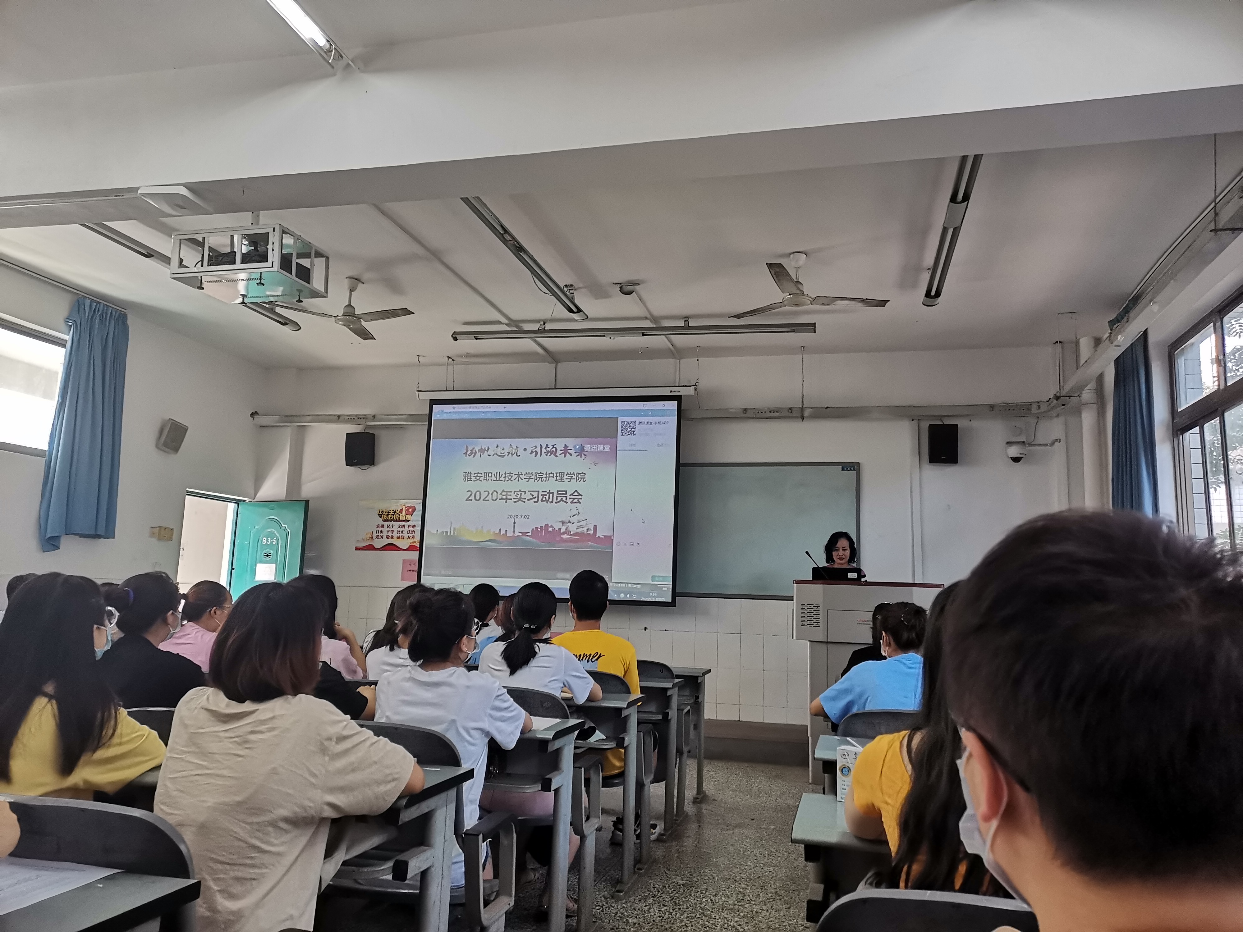 为稳步推进2020年实习工作,7月2日,太阳成集团tyc122cc采取线上线下相结合的方式组织召开了实习动员大会。本次动员会在腾讯课堂进行全程直播。本次动员会由护理公司党总支书记姚婕主持,经理王静做动员讲话,护理公司党总支副书记叶芋伶、实习管理老师及实习班辅导员老师出席活动,1200余名即将走上实习岗位的员工在教室观看动员大会直播。