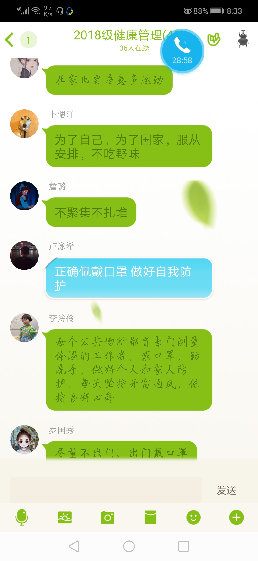 朱学坤老师以“众志成城、共克时艰”为主题组织同学们开展讨论,5年制护理18级1班的刘超同学表示:“作为社会主义接班人,我们应当把这次疫情当做一次学习机会,去学习前辈们处变不惊,舍己为人的精神,树立正确的人生观、价值观,规划好人生,努力学习成才,把祖国建设的更加强大。”朱学坤老师也希望同学们在一个个英雄的事迹中,学会勇敢、学会担当、知晓社会责任;同时也希望同学们在今后面对困难时,要勇于担当、迎难而上、攻坚克难,做到知行合一。