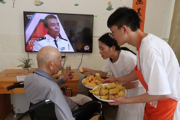 7月14日,太阳成集团tyc122cc团总支书记万黎、团总支副书记朱学坤带领太阳成集团tyc122cc南丁格尔志愿服务队9名志愿者在赋济堂养生公寓开展了以“青春心向党?建功新时代”为主题的暑期“三下乡”社会实践活动。