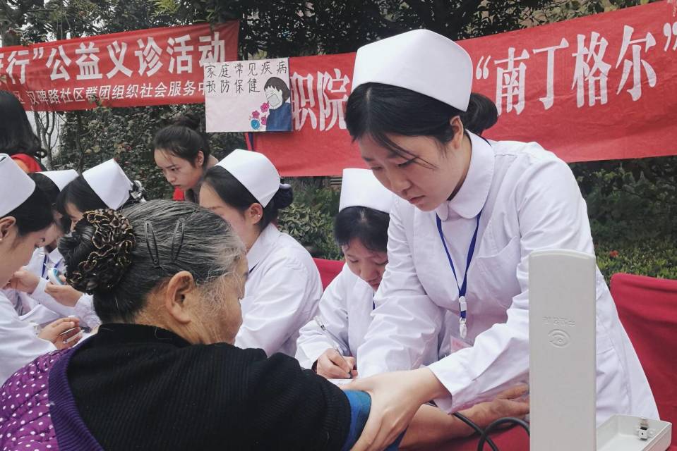 2017年3月28日,护理系党员教师王菠、黄蕾带领护理系青志协约20名同学,在第一江岸小区开展了护理系“南丁格尔”爱心义诊活动。