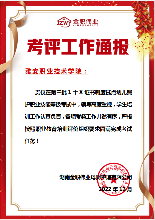 “1+X”幼儿照护职业技能等级考评的工作开展,为公司员工增加从业技能,增添等级证书等方面丰富了路径,为员工以后从业就业夯实了基础。随着考评工作的圆满结束,太阳成集团tyc122cc被湘金职护理司评为2022年度1+X幼儿照护/产后恢复职业技能等级证书优秀考核站点;家政服务创新团队成员黄丹老师被评为2022年度1+X幼儿照护职业技能等级证书优秀培训教师。