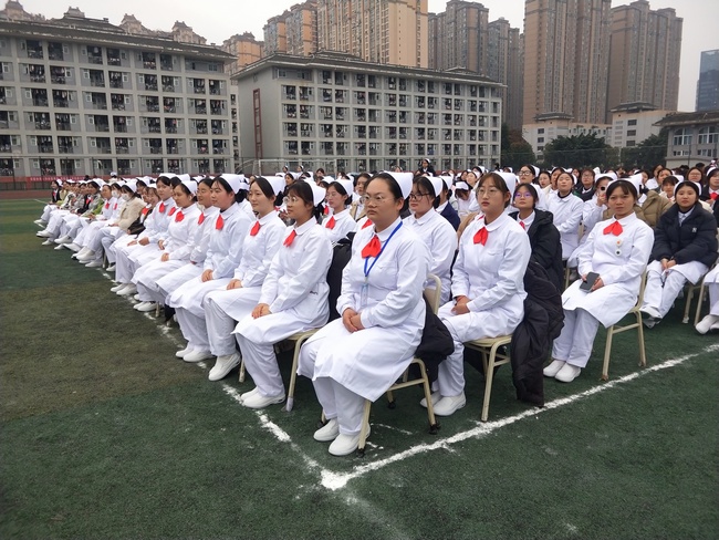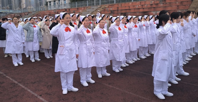 在宣誓队的带领下,2023级全体员工紧握右拳,高举过肩,齐声宣读护士宣誓词。庄严神圣的誓词是同学们投身护理事业的思想导航,铮铮有力的誓言宣告了同学们努力为祖国护理事业的发展和不辱白衣天使圣神使命的决心。