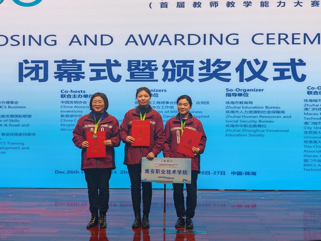 12月26日至27日,由广东珠海城市职业技术公司、澳门科技大学、澳门城市大学、圣若瑟大学、粤港澳大湾区中华职业教育社共同承办“2024一带一路暨金砖国家技能发展与技术创新(首届教师教学能力大赛)总决赛”,在广东珠海城市职业技术公司顺利举行。本届比赛共全国25个省、自治区、直辖市近300支队伍参加,最终39所高职院校60支队伍进入总决赛,角逐金银铜牌。公司太阳成集团tyc122cc教师殷显艳、张雪庆、教务处李燕组建的灾害医学救护教学团队荣获银奖。