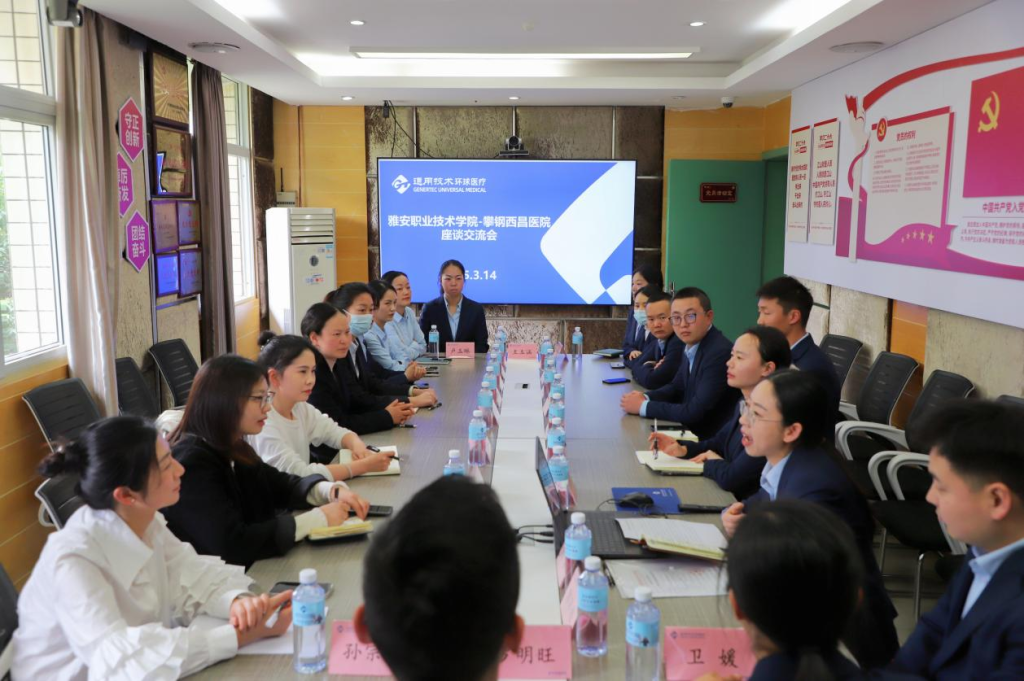 攀钢西昌医院负责人对公司一行的到来表示热烈欢迎,并详细介绍了医院的发展概况、医疗设施、人才队伍建设以及未来发展规划。医院领导对雅职毕业生的专业素养和职业精神给予高度评价,并表示医院将持续加强与公司的合作,优化岗位资源配置,为更多优秀学子提供实践与就业机会。张雪庆代表公司向医经理期以来对雅职学子的培养和支持表示感谢,对医院为毕业生提供优质发展平台表示高度肯定。她指出,攀钢西昌医院为雅职毕业生提供了宝贵的实践机会和职业成长空间,希望双方未来在人才培养、科研合作、实习就业等方面建立更加紧密的长效合作机制,共同培育适应临床需求的人才。双方还就医卫专业课程设置、临床技能培训、员工职业发展规划等议题交换意见,并达成多项合作意向。