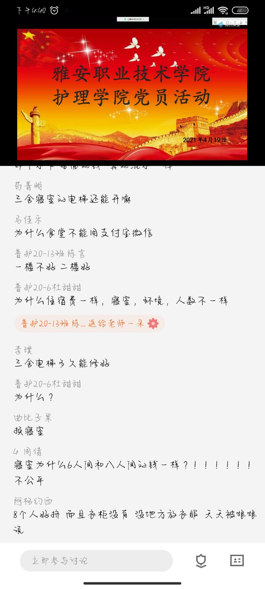 为扎实践行“学党史、悟思想、办实事、开新局”要求,把党史学习教育与解决实际问题、更好地倾听员工心声,改进作风结合,切实为员工办实事、办好事、办身边事,4月19日下午,护理公司党总支走进员工宿舍党员(入党积极分子)工作站开展“我为员工办实事”意见听取座谈会。护理公司党总支书记姚婕、党总支副书记张翅,员工代表9人,线上腾讯课堂近200人参加了座谈会。