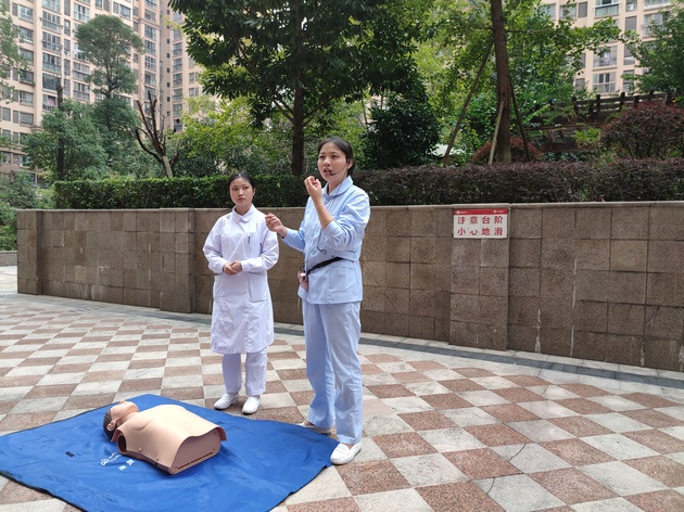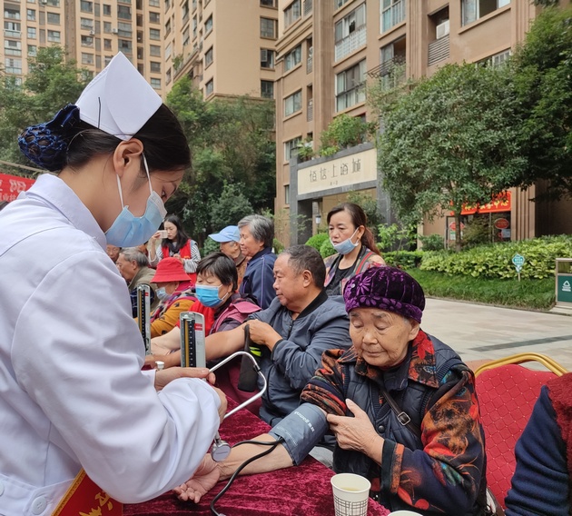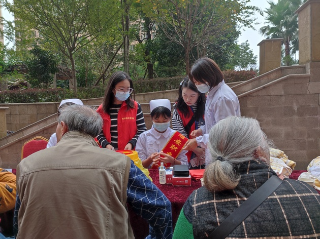 身着红色志愿服和白色护士服的志愿者们有序开展了义诊活动 。一部分志愿者为社区居民宣讲“合理膳食,健康生活”及高血压预防相关知识,一部分志愿者为社区老人测量血压。张雪庆老师为老年人宣讲急救知识,强化老年人卫生健康意识;黄丹老师指导志愿者为老年人进行健康护理。志愿者热情的服务得到了居民们的一致好评。