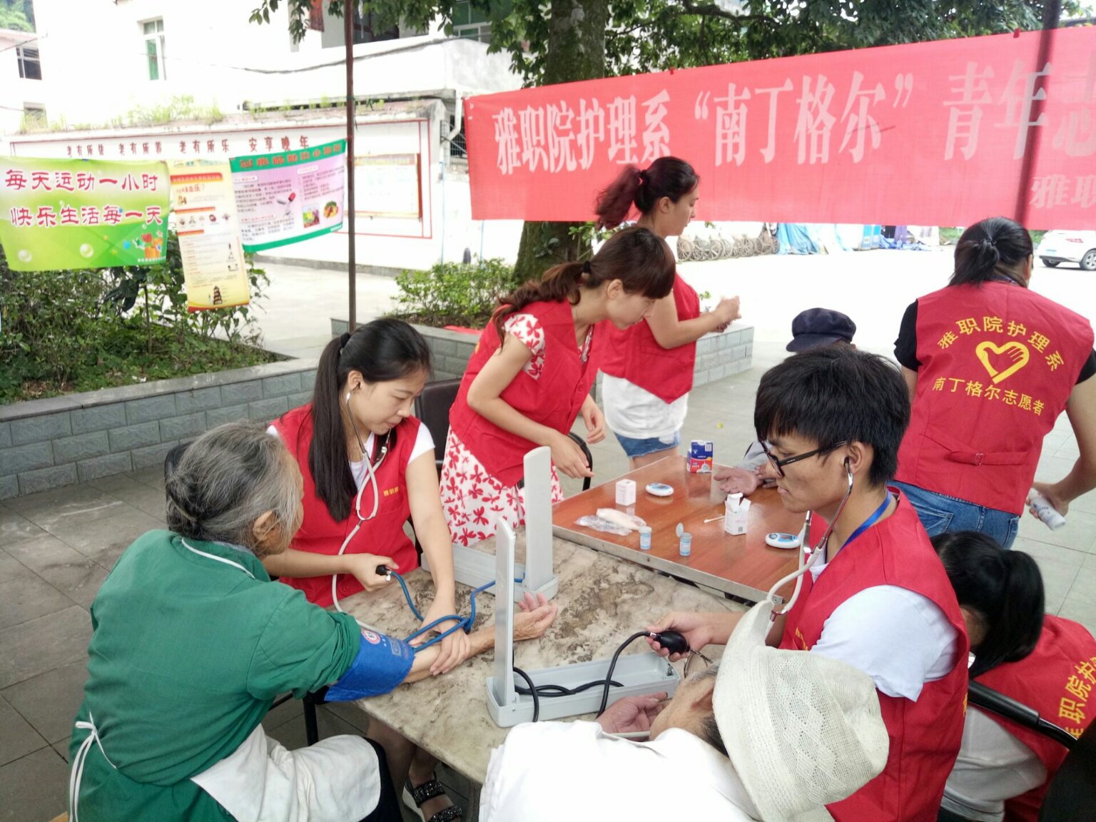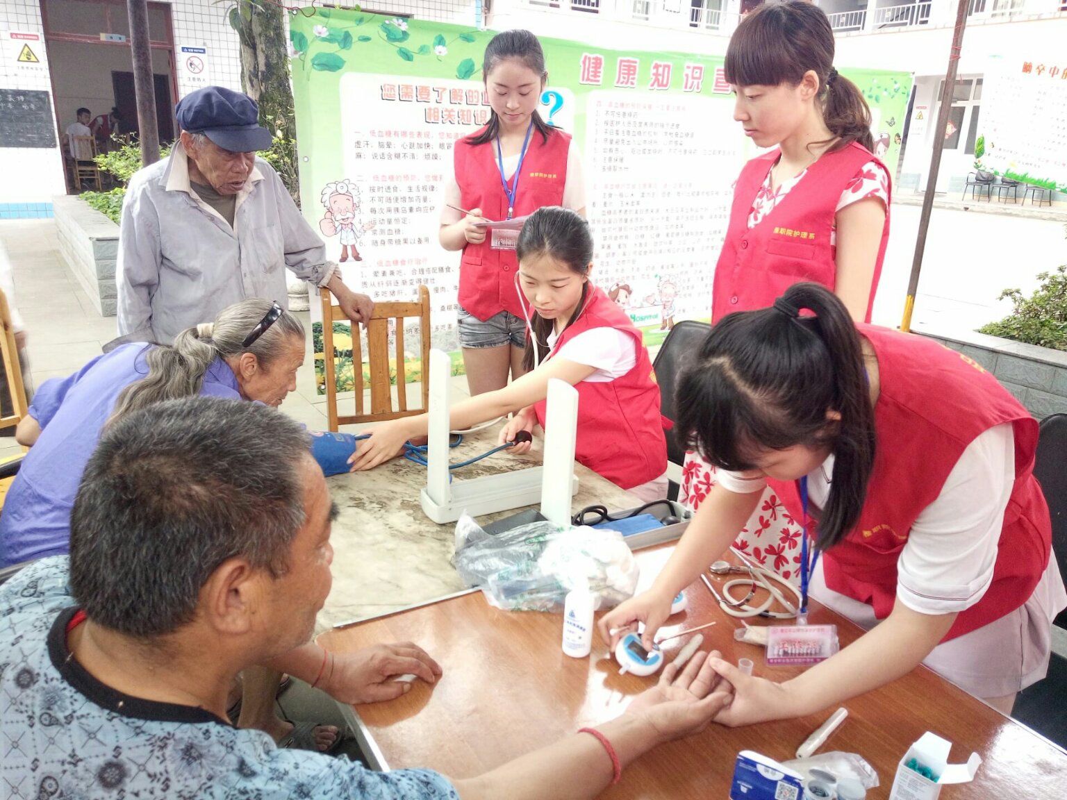 参加此次活动的有党员教师闵捷、邓雯、郭建梅以及部分员工代表。一大早,大家就采购好了新鲜的水果和蔬菜,直奔养老院。在养老院院坝里,党员教师和员工们与近20位老人围坐在一起,一对一地为老年人测血压、测血糖、做健康宣教、聊家常,员工代表为老年人还精心准备了歌唱节目和舞蹈节目。老人们边吃西瓜边看节目,脸上都洋溢着幸福的笑容。高亢的歌声在养老院的上空久久回荡,似乎诉说着党的恩情!最后教师和员工们一起亲手包饺子,为老人送上爱心午餐。